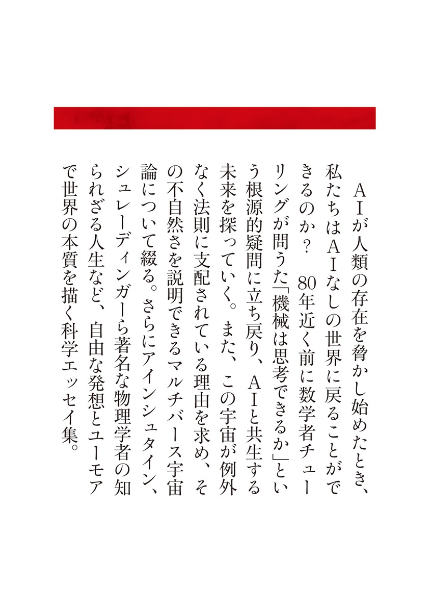 「AIが人類の存在を脅かしそうになったら、電源を引っこ抜くかハンマーで壊してしまえばいい」という過激な意見がある。だが実際、AIのない世界は実現可能だろうか? AIの氾濫という現代的なテーマから、この宇宙が法則に支配されていることの不思議をマルチバース宇宙論から読み解こうとする根源的な試み、あるいは、アインシュタイン、シュレーディンガーなど著名な物理学者のスキャンダルにいたるまで、自由な発想とユーモラスな文体で読む者をわくわくさせる17篇のエッセイ。