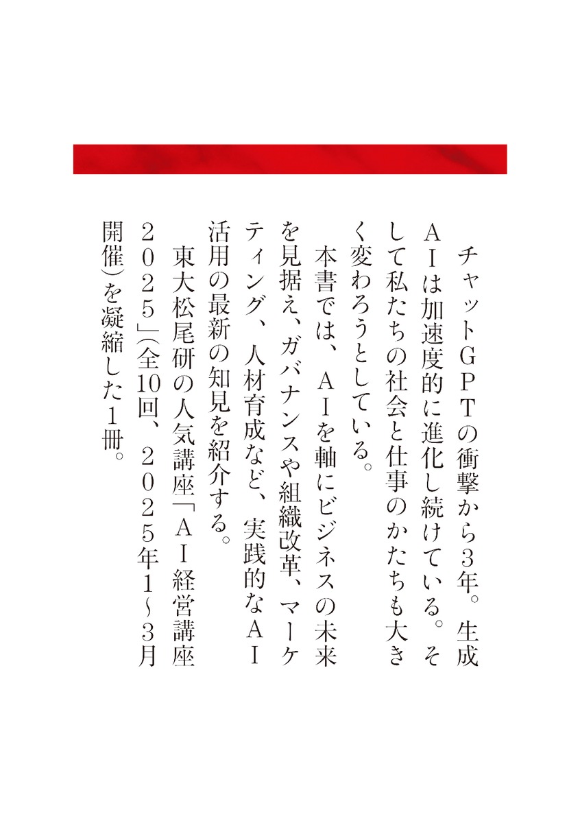 2025年1月~3月に開催された「AI経営講座2025」。約7000人が受講した人気講座の内容をダイジェスト。全10回行われた講座から要点を抽出し、わかりやすい新書にしました。