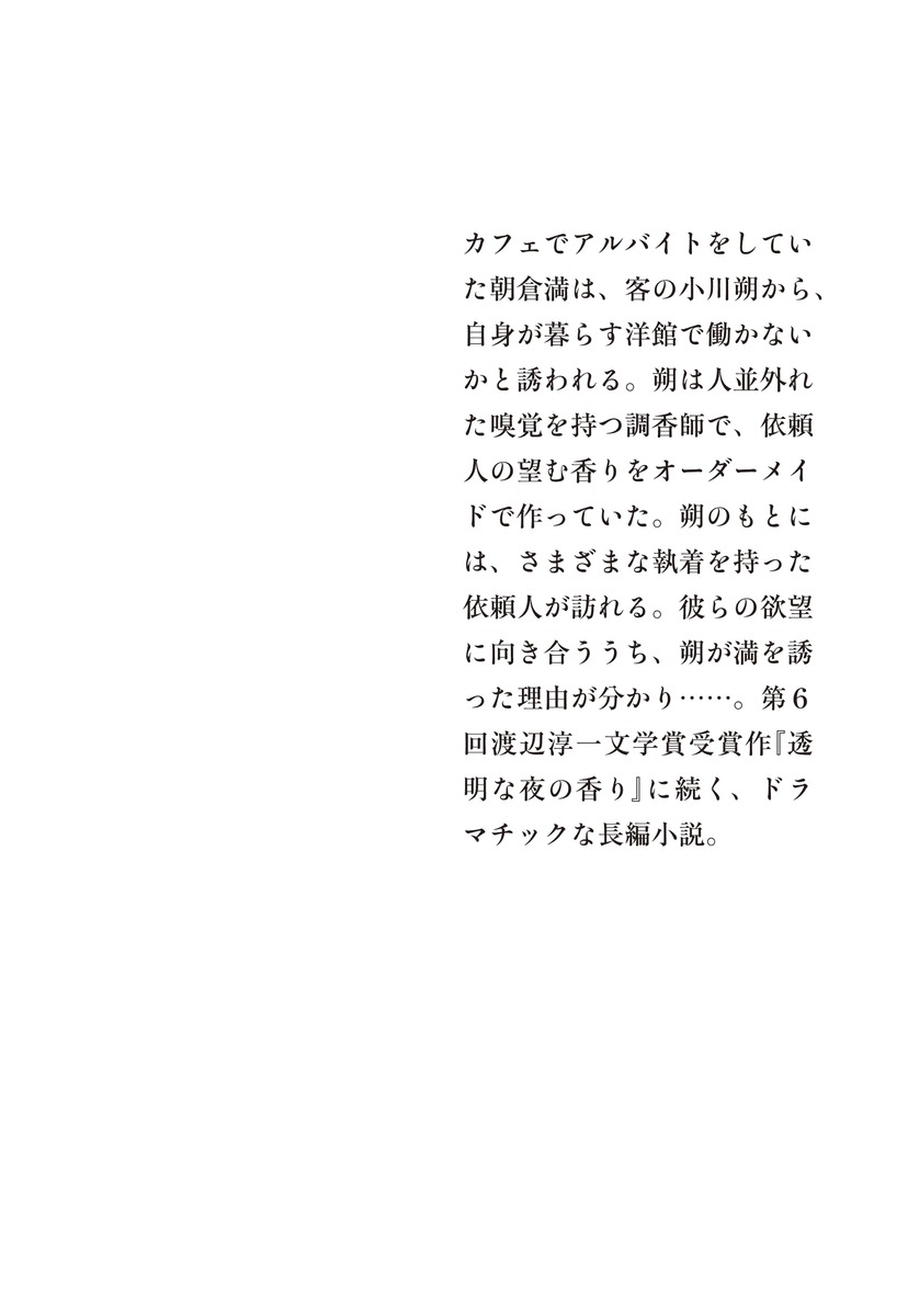 香りを文学へと昇華させた、第6回渡辺淳一文学賞受賞作『透明な夜の香り』に続く、ドラマチックな長編小説。