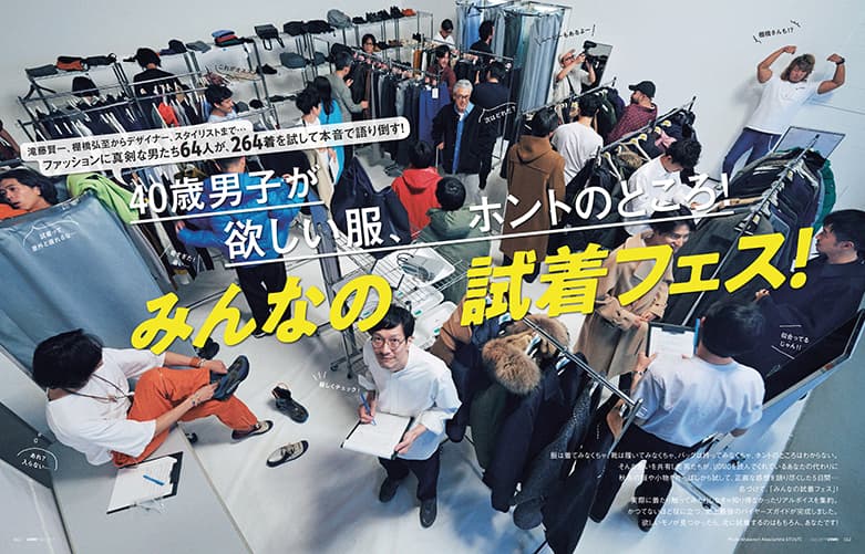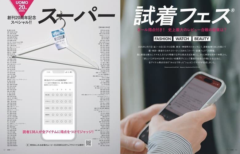 そんな読者の支持を集めているのが、2019年の初出以来、回を追うごとに評判を呼んでいる人気企画「試着フェス®」。様々なジャンル・ブランドの新作アイテムを一堂に集め、参加者を募って忖度なしの試着レビューを取り上げるという硬派かつ新しい発想でファンを獲得しています。2025年5月号では服・時計・美容の3つのカテゴリーで「スーパー試着フェス®」を開催し、国内外から138人の読者が参集しました。企業のタイアップや参加者同士のコミュニティも広がり、雑誌の枠にとどまらない一大イベントへと進化し続けています。