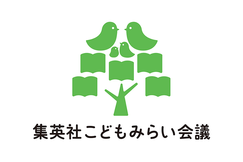 「集英社こどもみらい会議」のロゴデザインは、本や雑誌の木の上に、おとなの鳥たちが集まり、こどもの鳥たちの「みらい」について話しあう様子を表現しています。これは、集英社の「集」の旧字体・雧が木の上に隹(ふるとり)が3羽とまっている姿を字源とすることから着想を得たもの。