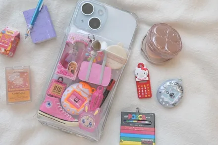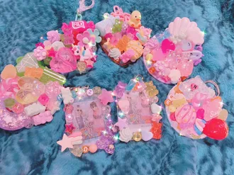デコパーツを集めてクリア素材の板に張り付け、キーホルダーをつくること(パーツは原宿・竹下通りで集めました)。